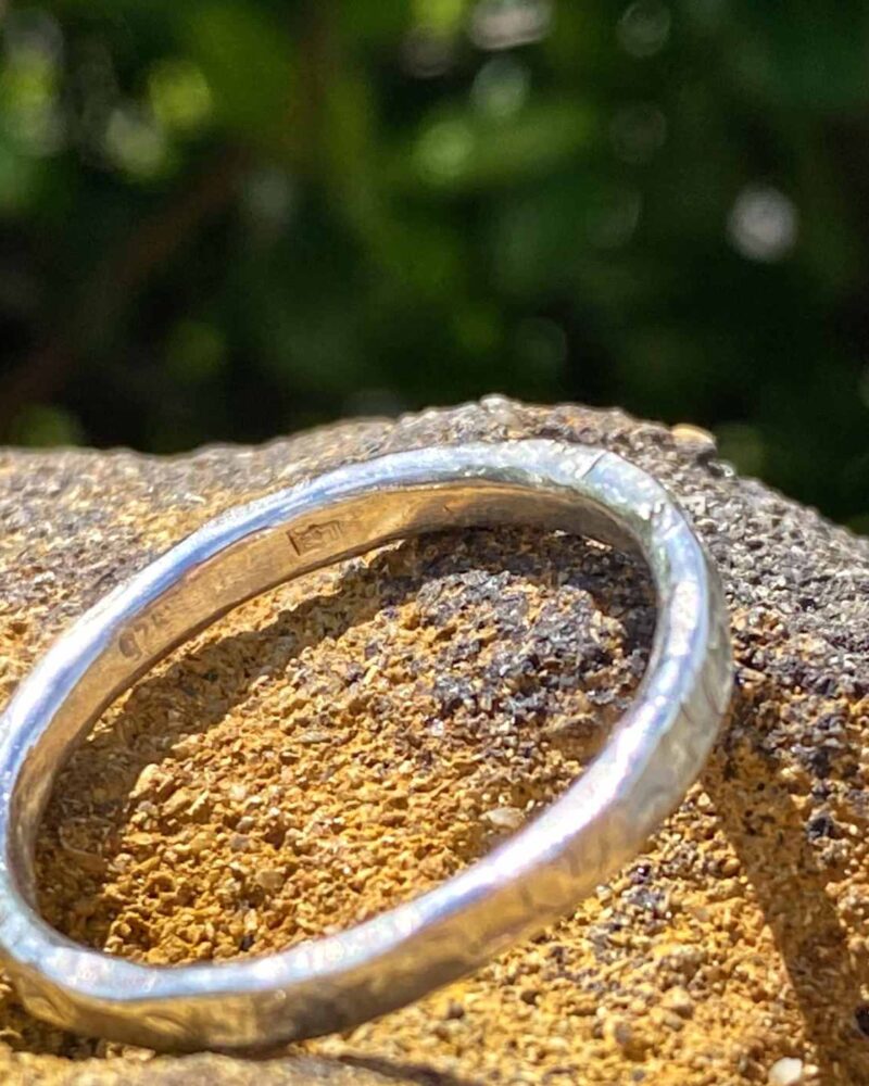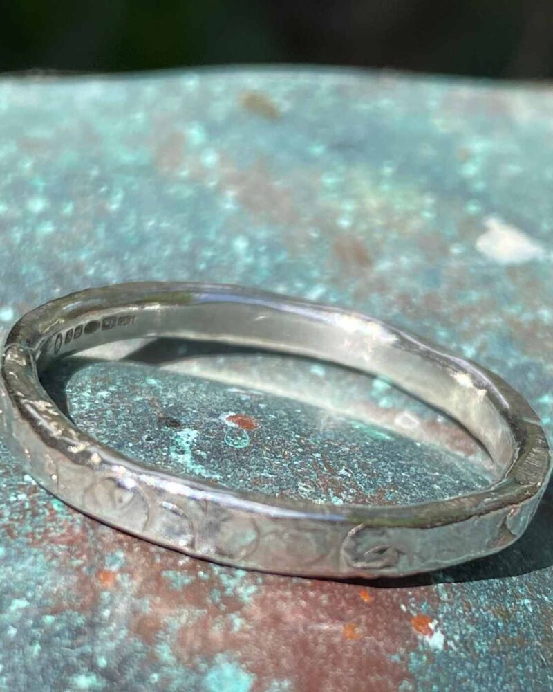 Fethys is Cornish for Beaten – using the hammer to texture the Sterling Silver leaves hundreds of marks which catch the light and give wonderful texture to the ring. Â I have also textured along the edges of this gorgeous ring giving it an ancient feel – perfect for bigger fingers or even your thumb!