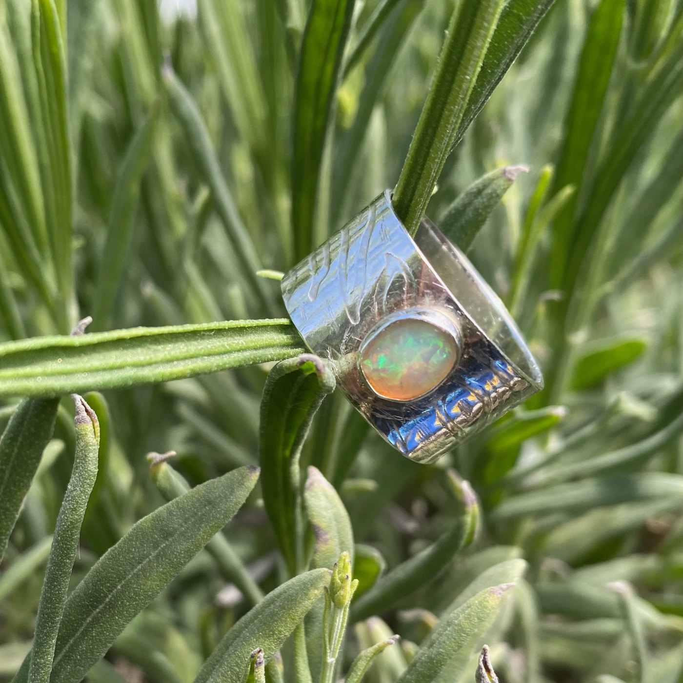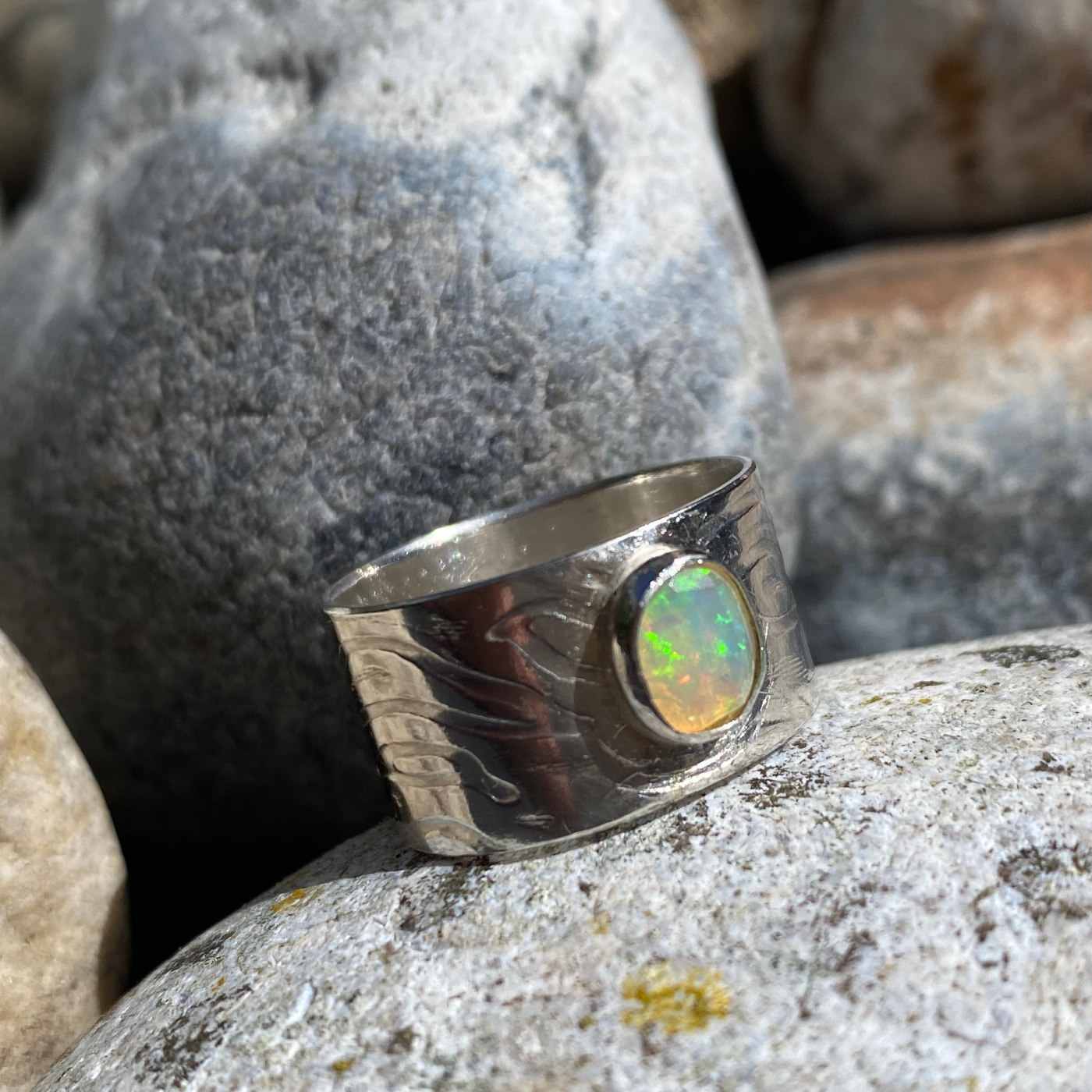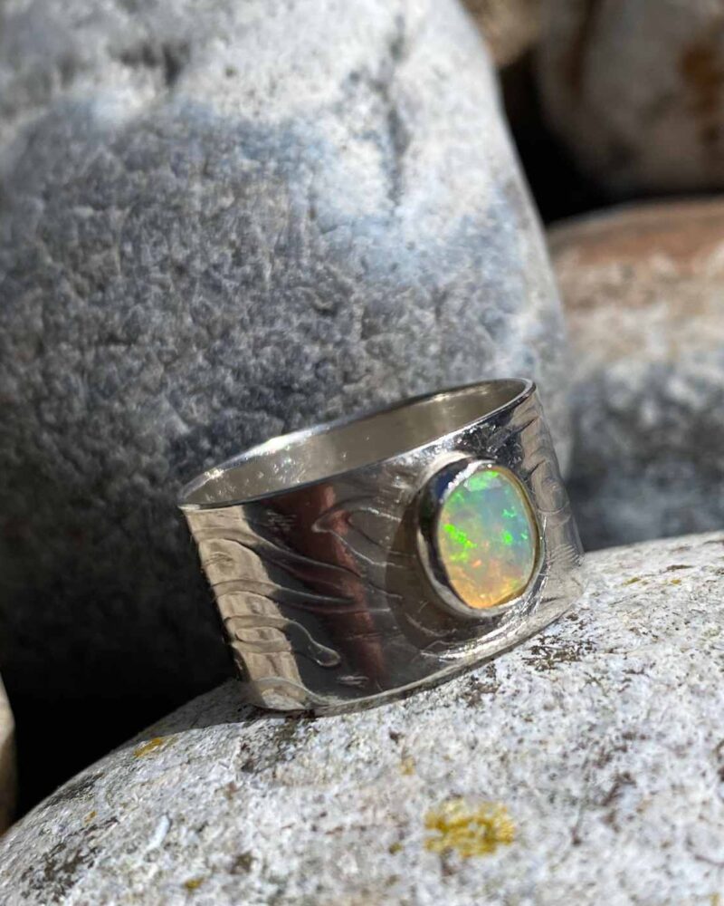 The handmade Frosa Flow Sterling Silver ring is textured around the band with a pattern of rippling water.  The Ethiopian Opal shimmers with multiple hues.  It flows and glimmers around your finger effortlessly.
