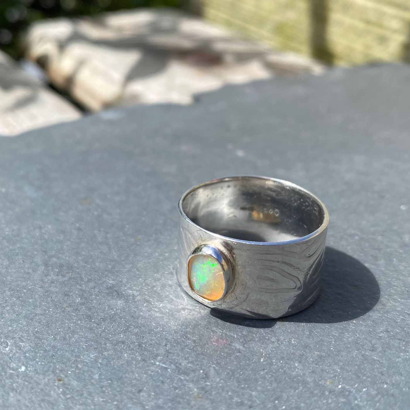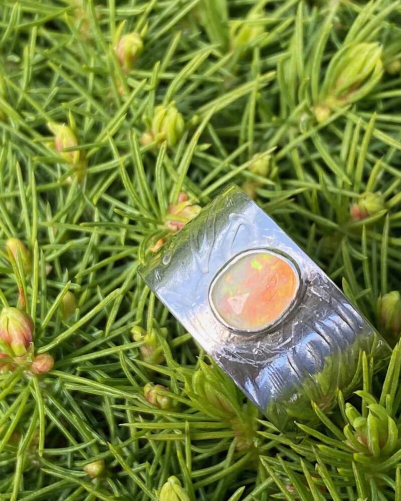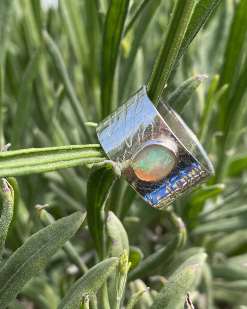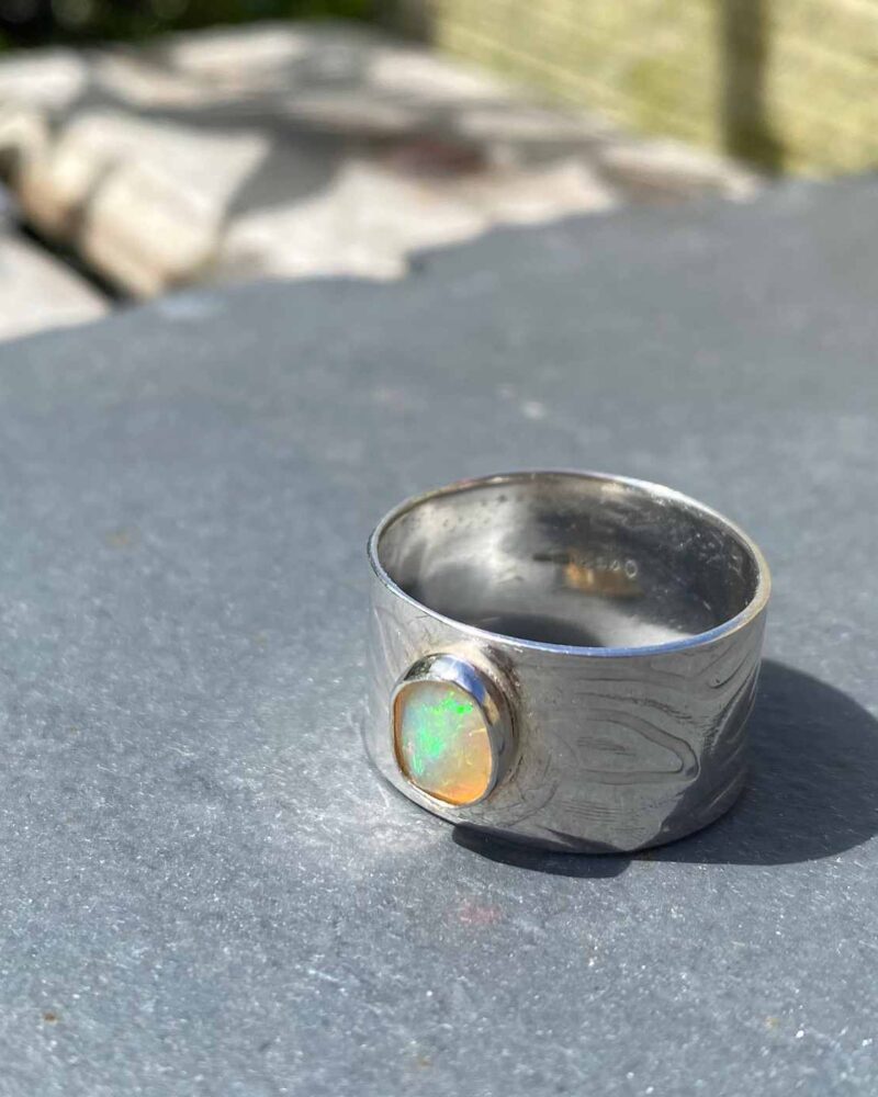 Frosa Flow Solid Silver and Ethiopian Opal Wide Band Ring. Size R